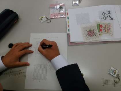 3年生の授業で、被服実習をしています。写真の男子生徒は、絵柄を考えています。