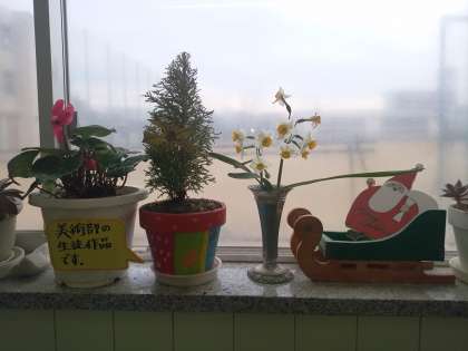 校内で咲いた水仙も、生徒作品と一緒に、学校を和やかにしてくれています。