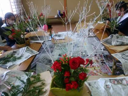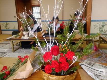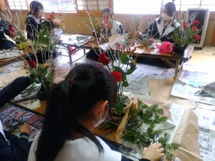 茶道部の生徒が、お花を活けていました。何度か練習をしていたからか、とても上手に行けていると思うんですが、いかがでしょうか。