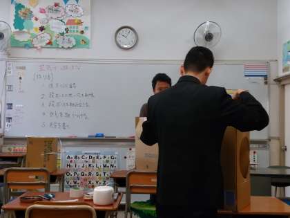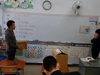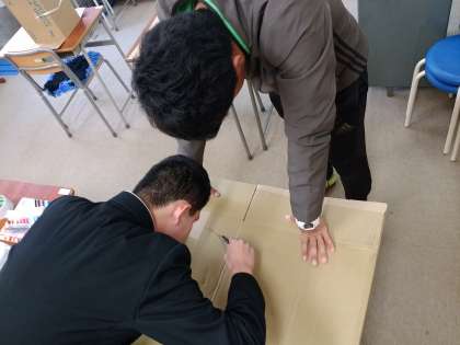 段ボール箱に穴をあけて、空気を送る「箱」を作ります。
