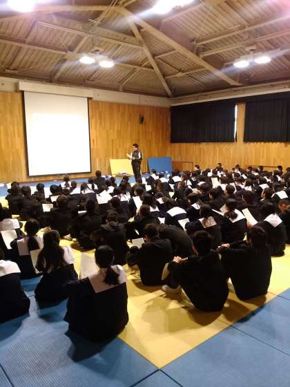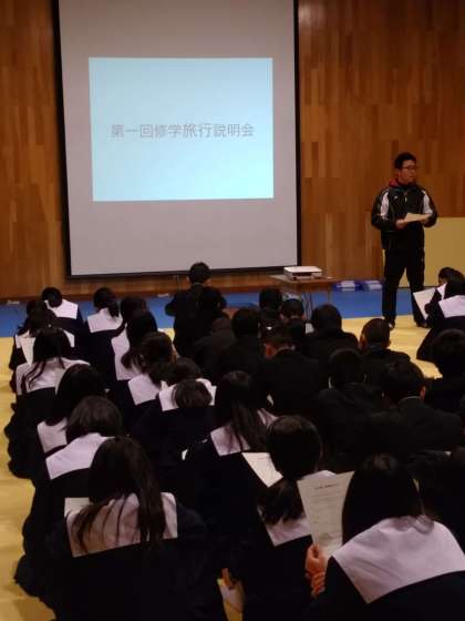 本日、2年生は、修学旅行に向けての説明会を行っています。まだまだ早いと思って、実感のない生徒達は、どこへ行くんだろう、いつ行くんだろうと、興味津々。