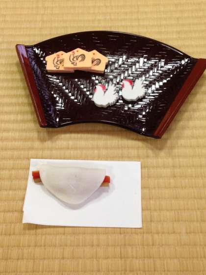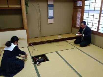 本日茶道部の初めての活動です。年が明けて初めて窯に火を入れることを「初釜」というそうで、校長先生もお点前を受け、花びらもちを堪能されていました。
