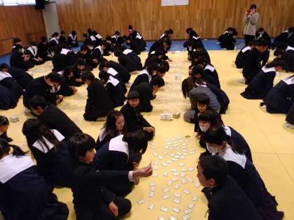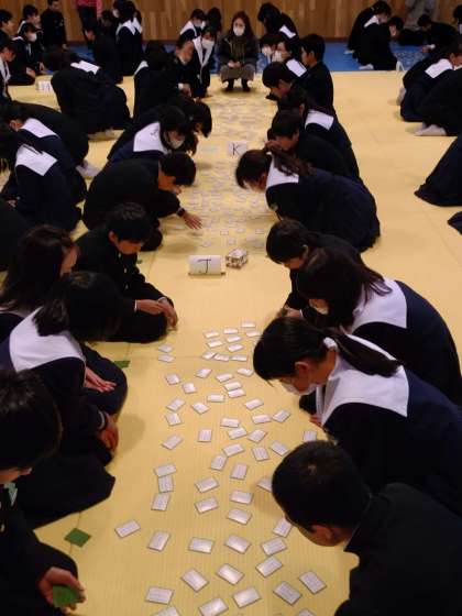 本日待望の百人一首大会が行われました。1年生は、読み手の先生の声に、下の句を待たずに沢山取る生徒も居ます。