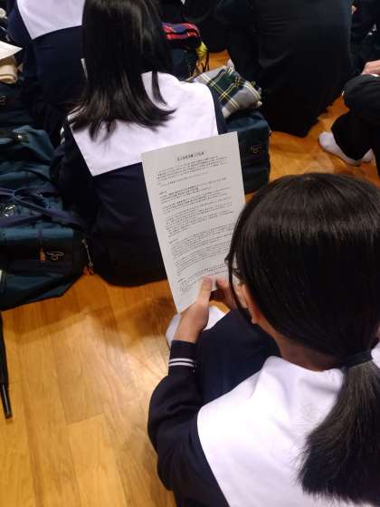 生徒達は、受験票を忘れたときや、電車で迷ってしまったときなど、緊急事態に対する対処法。持参すべきものや会場に持って入れないものなど、細部にわたって記載したプリントを見ながら、説明に聞き入っています。