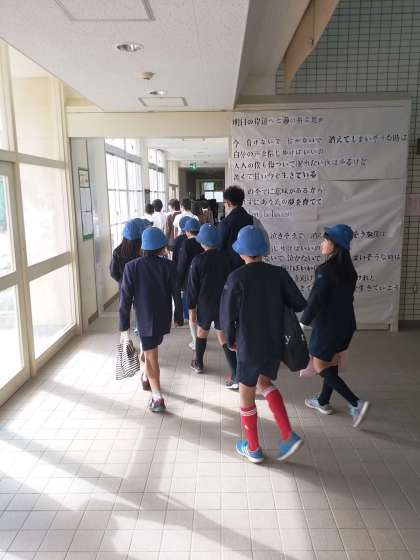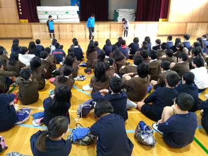 6年生が登校しているところと、体育館で、各部員による部活動紹介をしているところです。