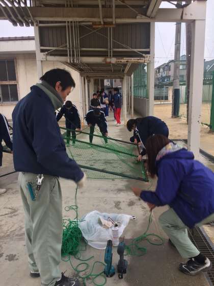 今日はソフトボール部の女子生徒と管理作業員さんで防球ネットの修繕をしました。