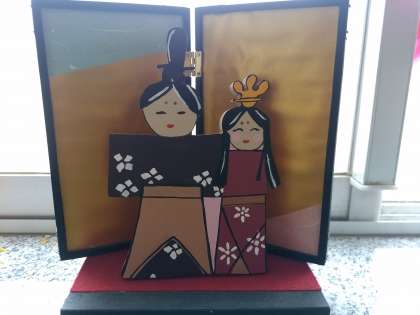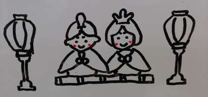 こうない手づくりのものや、掲示板に描いたものなど、明日のひな祭りに華を添えています。