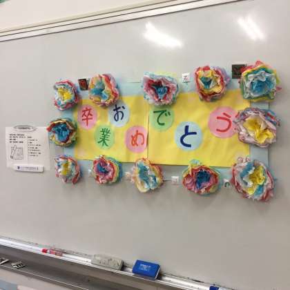 「今日は、私たちのために送る会を開いてくれてありがとうございます。今日までの準備も本当にありがとうございました。私たちは、支援学級の思い出を胸に、3月14日に卒業します。合同うんどう会や職業訓練など一緒に参加でき、よかったです。私たちも高校に行ってもがんばるので、みなさんもこれからは先輩として、新入生と一緒にがんばってください。」