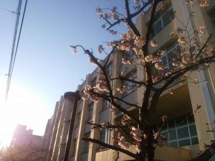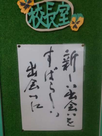 晴天に恵まれた新学期のスタートです。東からの朝日を浴びて、玄関の校章も胸を張っているようです。
