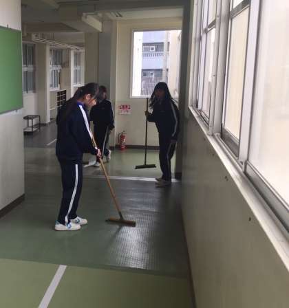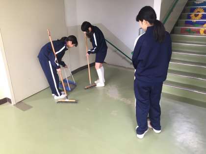 明日の入学式を前に、吹奏楽部員が廊下や階段の清掃をしています。毎日やっても土汚れが絶えることのない校舎内を箒で掃いています。