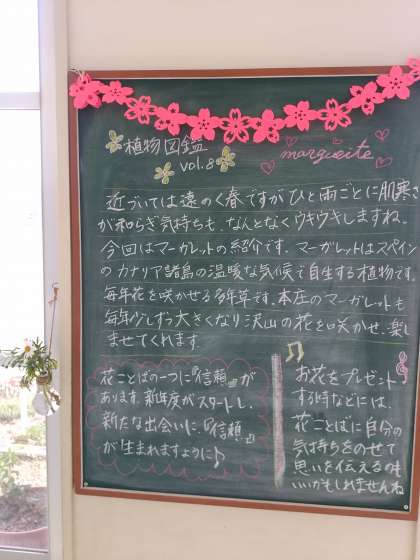 1階廊下には「植物図鑑」という植物に関する解説があります。この窓から、グラウンド側を見ると、ハーブなどの植物が栽培されているところが見えます。