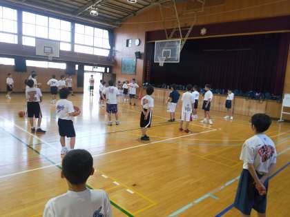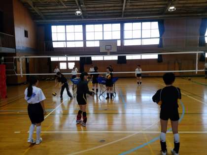 体育館でも新入生に先輩が指導しています。バレーボール部もバスケットボール部も沢山体験に来てくれています。