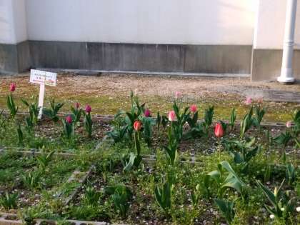 正門西側のチューリップも朝日を浴びて、もうすぐ咲きます。