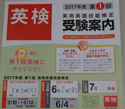 本日より英検の申し込みが始まります。5月2日(火)が締め切りですのでご注意ください。