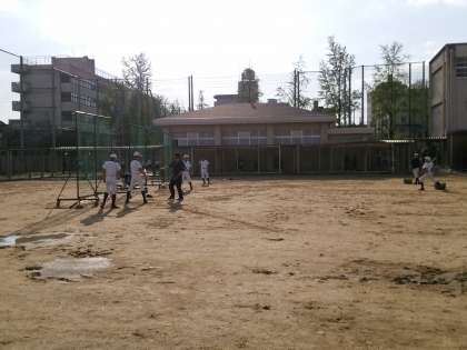 野球部はバッティングについて指導を受けています。見づらいですが、奥では体験に来た生徒が素振りをしています。