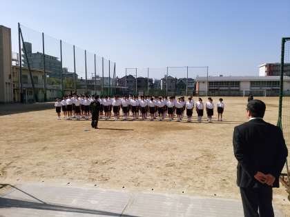 回れ右、きをつけ、前へならえなど、先生の号令に合わせて、声を出して動きます。