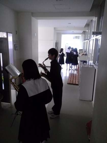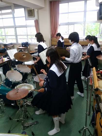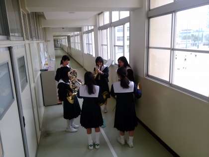実際に楽器に触れています。先輩から音の出し方を聞いています。