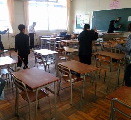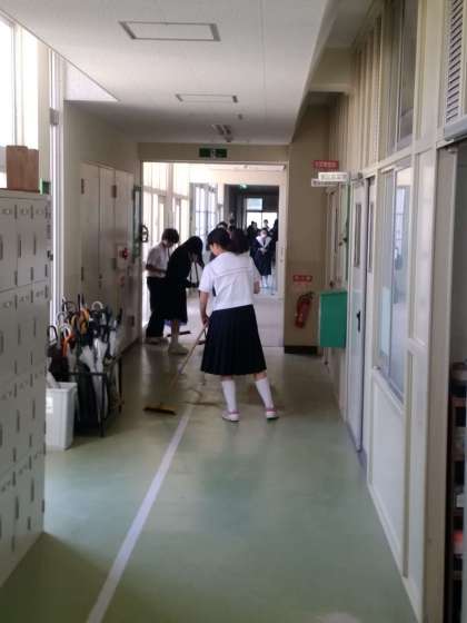 放課後の掃除の時間です。教室や廊下、階段を分担して掃除しています。