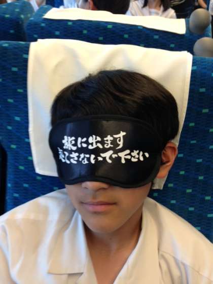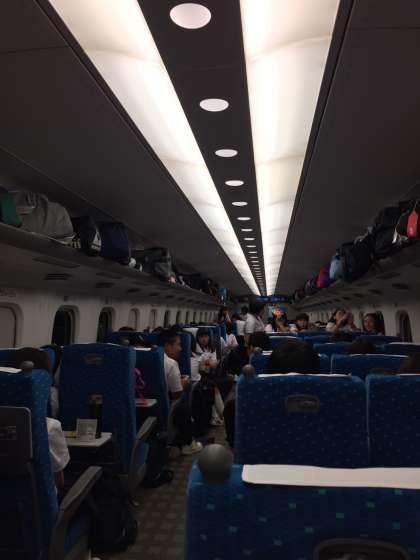 新大阪へ向かう新幹線の中では、おしゃべりを楽しんでいる生徒や、ねむている生徒が居ます。