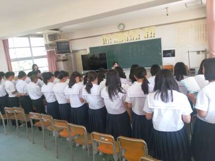 音楽の授業では合唱をしています。先生のピアノの演奏に合わせて、大きな声を出してうたっています。