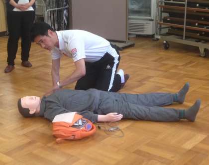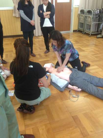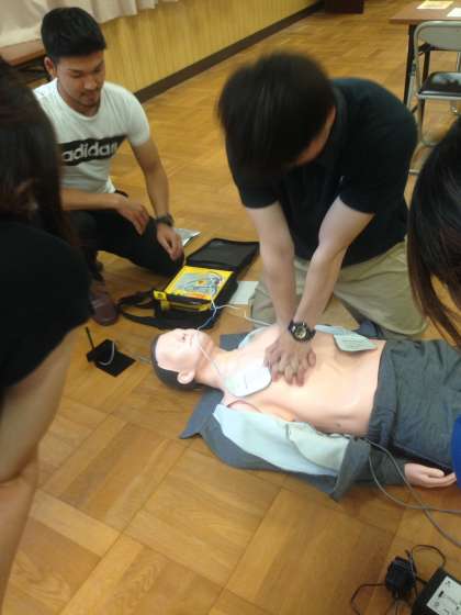 応急手当普及員に、胸骨圧迫や人工呼吸の指導を受けています。