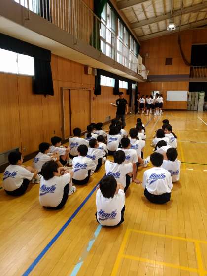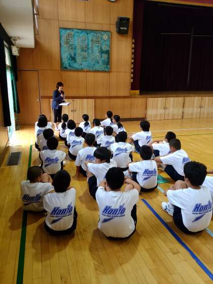 体育大会のプログラムごとに集合し、本番での動きや整列の順番などの説明を受けています。