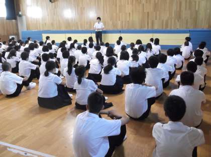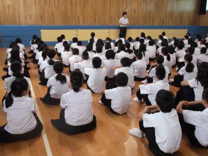 体育大会目前にして、「勝とう!」という事をもっと意識しようとのお話がありました。クラスや団で勝つには、クラスの仲間のことを思ったり、頑張っている仲間を応援したりが大切であるという内容に、1年生は真剣に聞き入っています。