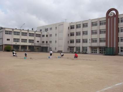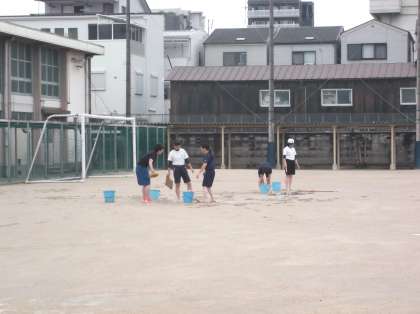 グラウンドでも、ソフトボール部員やラグビー部員が、水溜りの水を抜いています。