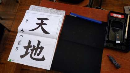 筆を使って「天地」という字を書いています。