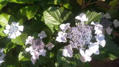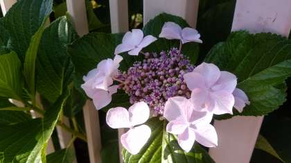 学校北西角の額紫陽花はよく見ると紫色と淡いピンクの2種類があります。酸性の土だと青色、アルカリ性ならピンク色。土質による影響が花の色を決めると言われている紫陽花。同じ場所で違う色を付けることは大変珍しい事だそうです。