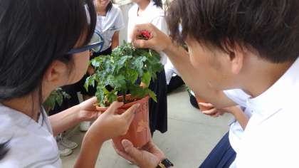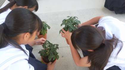 技術で栽培しているミニトマトですが、色の変わってしまった葉を間引くなど、健康管理をしています。