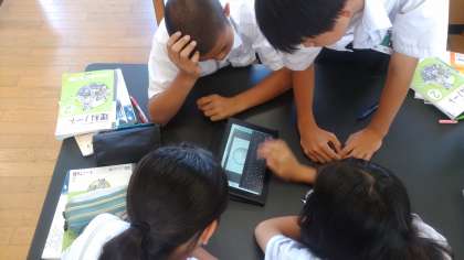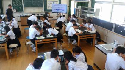 理科の授業では、電子黒板やタブレットを駆使し、アプリケーションソフトウェア−で原子の組み合わせをしています。