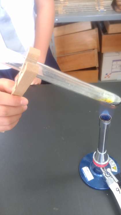 理科の実験です。鉄と硫黄の混合物を加熱して変化を見ます。