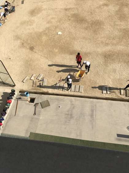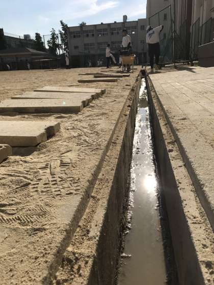 グラウンドの側溝や会所に溜まった土を上げてくれている女子ソフトボール部。