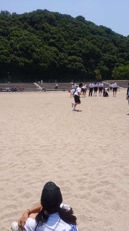 ビーチリレーをしています。砂浜ではうまく走れません。