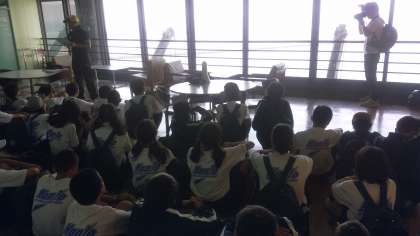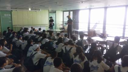 館内ラリーに出掛ける前の説明を受けています。部屋班ごとに問題を解いていきます。