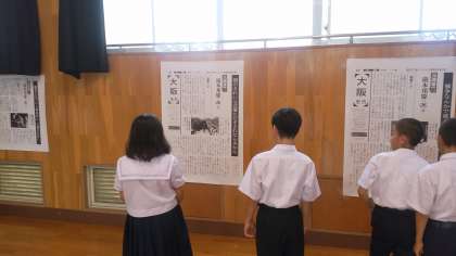 この時間、1年生は、パネルや当時の新聞記事を見ています。