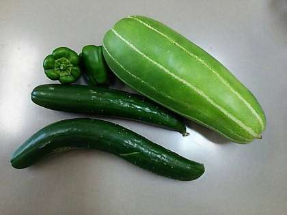 やまぶき、万願寺とうがらし、玉造黒門うり、キュウリ、ピーマンです。