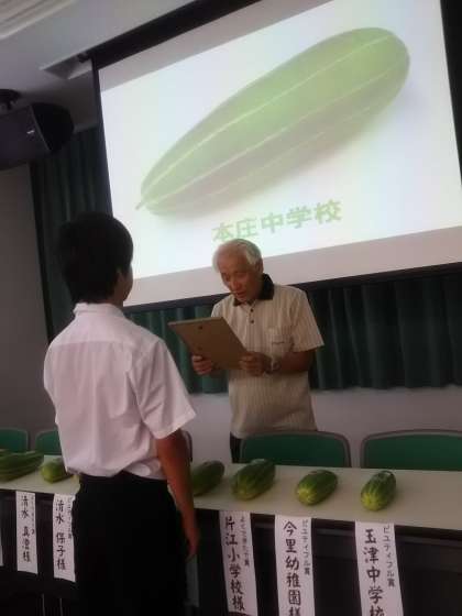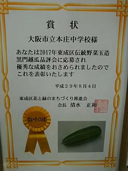 今年も、なにわの伝統野菜、玉造黒門越瓜の品評会に出展させて頂き「ビューティフル賞」を戴きました。今年は生徒も手伝ってくれたので、表彰式に生徒が参加してくれました。