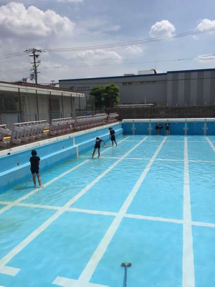 女子バレー部の生徒が、水を抜いたプール清掃してくれています。