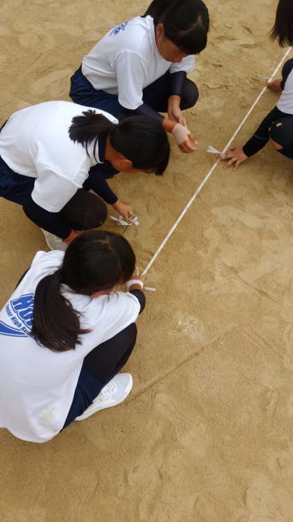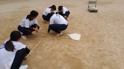 ソフトボール部は、ホームベースやバッターボックスの正式な作り方を学習し、実際測量しながら作っています。