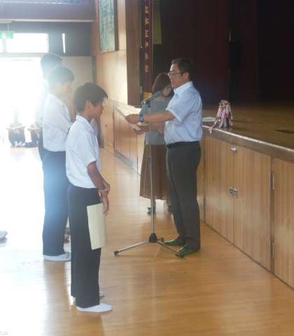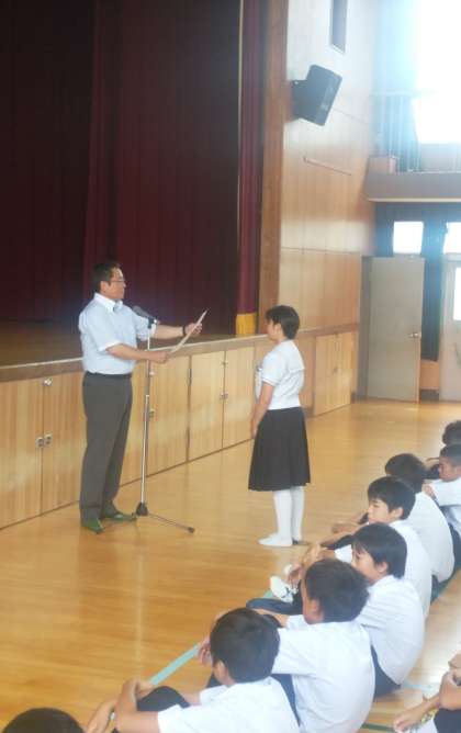 始業式を終え、各部の表彰をしています。野球部や卓球部、サッカー部、バレーボール部など、この夏に本当に生徒達は頑張ってくれました。