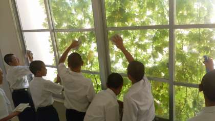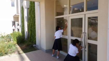 朝のふきふきキャンペーンも最終日で、沢山の生徒が手伝ってくれています。