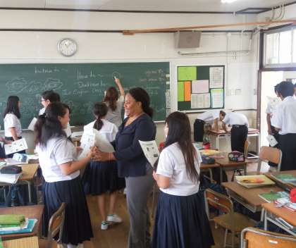 2年生英語に授業は、単純割りをして、発音中心の授業と筆記や文法中心の授業に分かれて展開をしています。