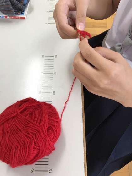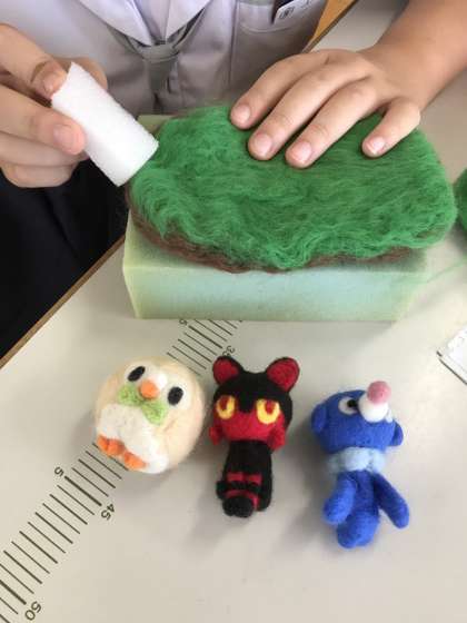 家庭科部では毛糸でコースターを作ったり、羊毛を専用の針で突き刺しすることでフェルトの布になっていきます。