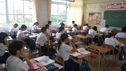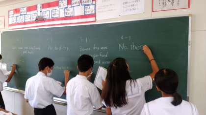 社会の授業でも質問の解答を班で考えて小さなホワイトボードに書いて提示します。