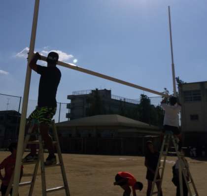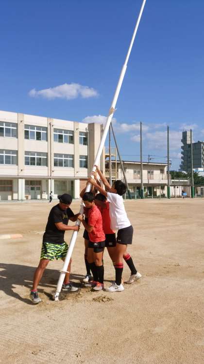 明日の公式戦会場の準備に向け、ラグビー部員は、Hゴールを立てます。