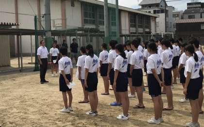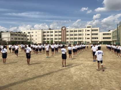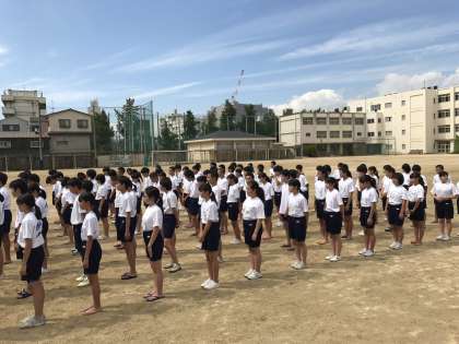 まずは校長先生のお話を聞き、準備体操をしています。