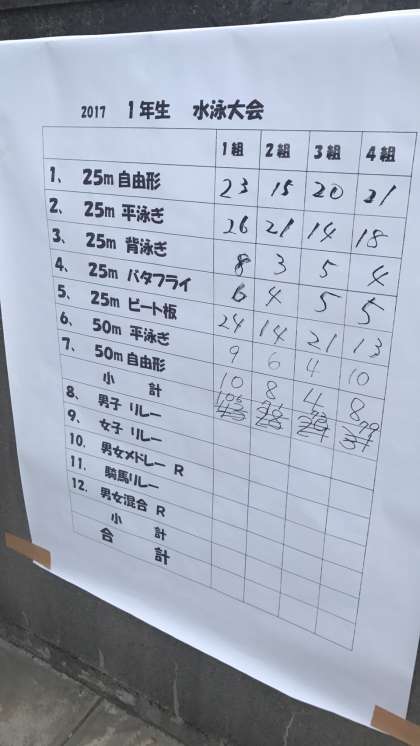 9月14日(木)午後2時半 1年生水泳大会途中経過です。 接戦が続いています。