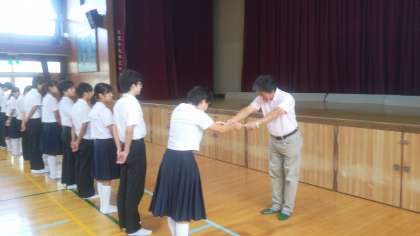今日は学年集会です。各学年、水泳大会の個人表彰などを行いました。